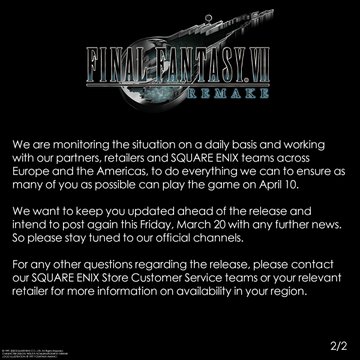 We are in constant contact with our distribution and retail partners and are actively monitoring the situation for distribution of FINAL FANTASY VII REMAKE. As we receive more information about specific country-level distribution details, we will update you. We appreciate your patience and understanding as the situation develops over the coming days and weeks.