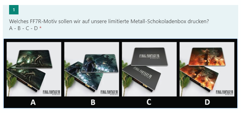 Wer von euch eine exklusive, streng limitierte FINAL FANTASY VII Remake Metall-Schokobox (samt Inhalt) gewinnen möchte, der sollte jetzt hier über sein Wunschmotiv abstimmen. #FF7R 👉 https://t.co/o4p5sGHVVh pic.twitter.com/BjvZWO71rl